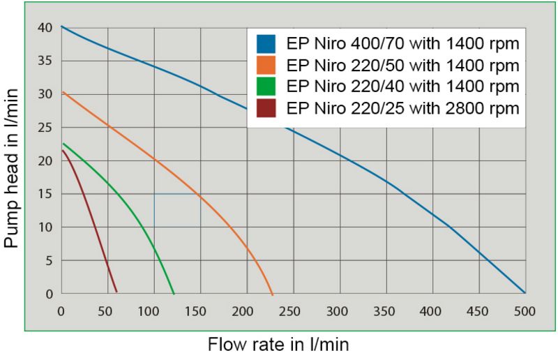 flow rate max. litres 52 l/min flow rate max. m³ 3,12 m³/h max. pressure 1,7 bar Inlet/outlet 1 ¼“ mt Impeller material Stainless Steel AISI 316 , Shaft sealing ring Viton® (FKM) Material pump housing Stainless Steel AISI 316 Electric motor Voltage (AC) 400 V, Nominal frequency 50 Hz Nominal power 0,56 kW, Rated current (AC) 3,5 A rotation max. 2800 min-1 Material motorshaft Stainless Steel AISI 316 Protection class IP55 Electrical connection Control board Without cable and plug weight 8,9 kg