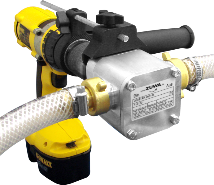 Passender Adapter für die Verbindung der Pumpen mit allen Standard- Bohrmaschinen oder -Akkuschraubern. Einfache Befestigung der Pumpe am Bohrfutter, Fixierung mit Bohrtiefenanschlag
