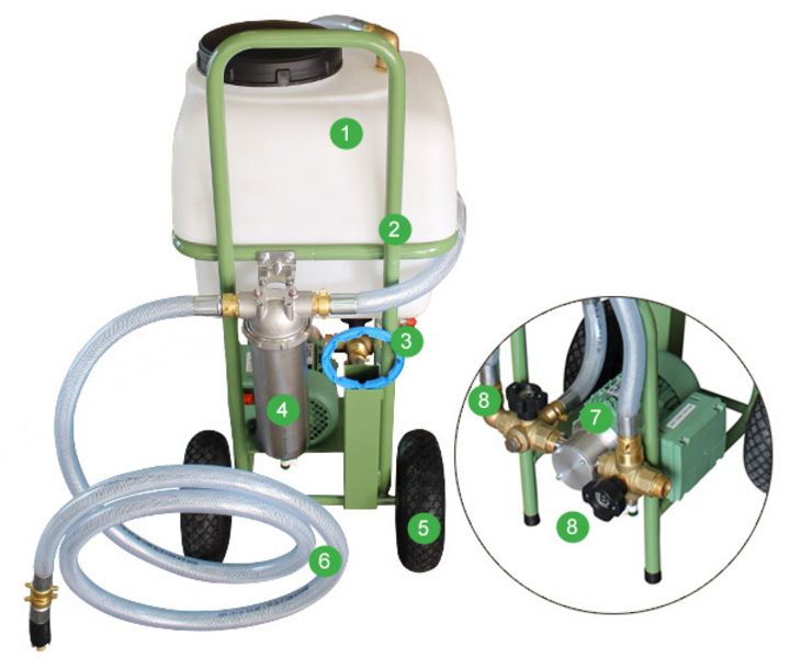 Impellerpumpe Combistar 2000-B max. Fördermenge (l) 60 l/min max. Fördermenge (m³) 3,6 m³/h max. Förderdruck 5 bar Ein-/Ausgang 1" aG Impeller Perbunan® (NBR) Werkstoff Buchse Polyamid Perbunan® (NBR) Werkstoff Pumpengehäuse Edelstahl 1.4404, Aluminium AlMgSi1 Elektromotor Nennspannung (AC) 230 V, Nennfrequenz 50 Hz Nennleistung 0,55 kW, Nennstrom (AC) 4,3 A Anlaufkondensator 40 µF, Betriebskondensator 20 µF max. Drehzahl 2800 min-1 Werkstoff Motorwelle 1.4404 Schutzart IP55 Motorschutz (therm.) 130 Ausstattung/Zubehör : Behälter 55 L , max. Füllinhalt 50 l, Werkstoff Polyethylen Einteiliges Fahrgestell mit zwei Luftreifen Kerzenfiltergehäuse aus Edelstahl, 75 µm Montageschlüssel zu Kerzenfiltergehäuse aus Edelstahl Art.158305 2 x 3 m PVC-Schlauch mit Gewebe, transparent, 1" Zusätzlicher 3-Wege-Multifunktionshahn in der Ansaugleitung zur Filterumgehung. Abmessungen B 47 cm x H 105 cm x T 66 cm Gewicht 40 kg