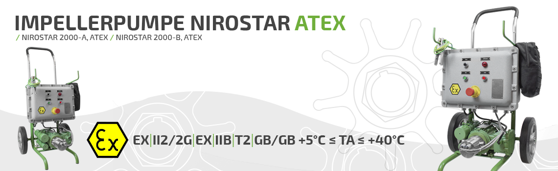 Die NIROSTAR ATEX ist die weltweit erste Impellerpumpe mit ATEX-Zulassung. Die komplette Elektronik ist zusammen mit der Pumpe auf einem stabilen Wagen mit großen Vollgummireifen (elektrisch leitfähig) und höhenverstellbaren Teleskopgriff montiert, womit sie zur idealen Lösung für den mobilen Einsatz auf dem Werksgelände wird. Dank der kompakten Bauweise ist die NIROSTAR ATEX in fast jedem PKW transportierbar.