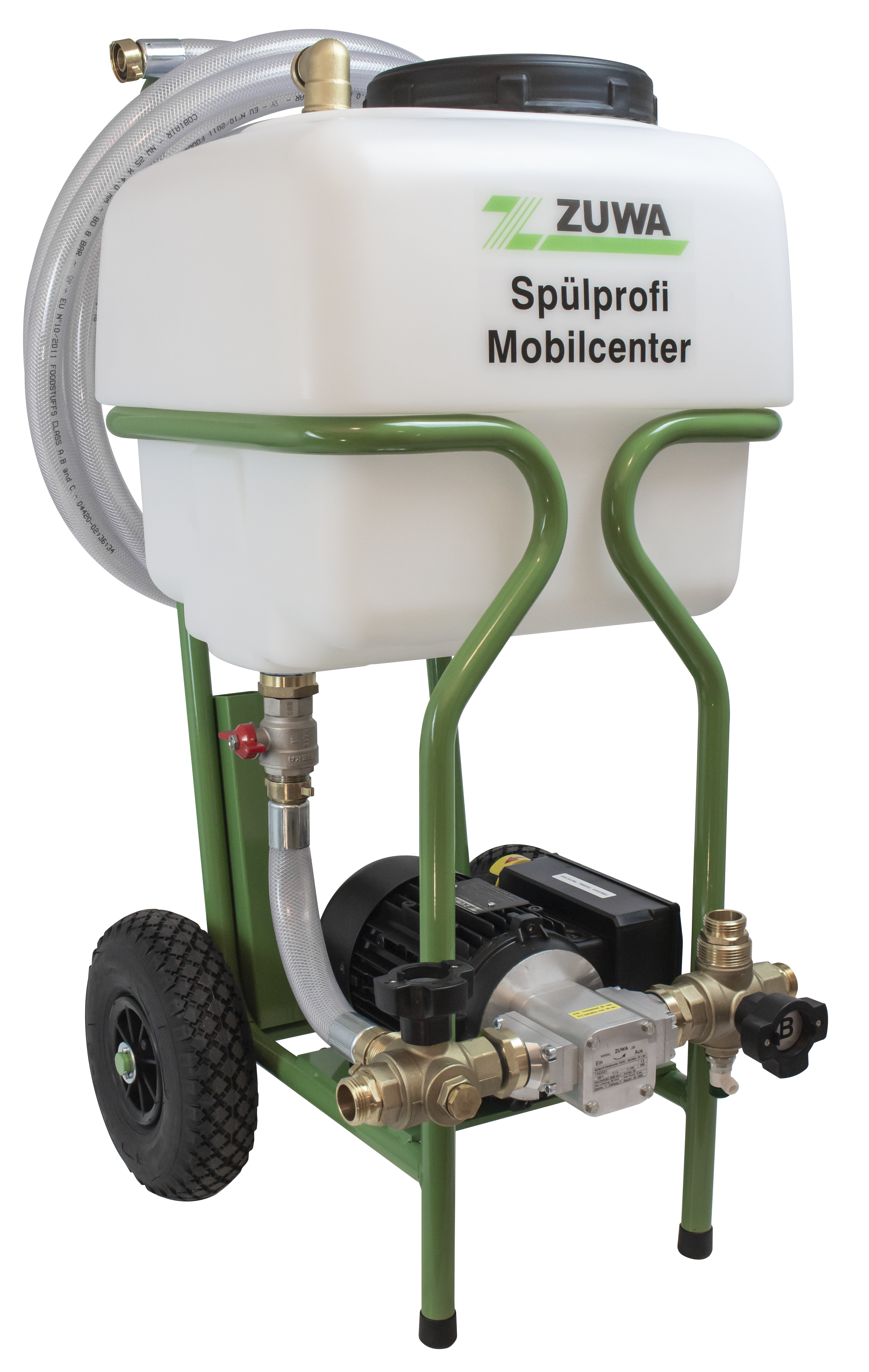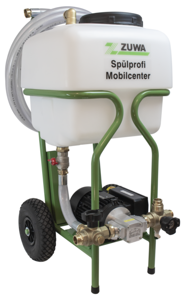 Das Spülprofi Mobilcenter 90/55 ist mit einer leistungsstarken Pumpe ausgestattet. Die beiden Multifunktionshähne erlauben den Anschluss von externen Behältern, zum Beispiel IBC, und die Ausführung verschiedener Arbeitsschritte nacheinander ohne Umstecken der Schläuche.