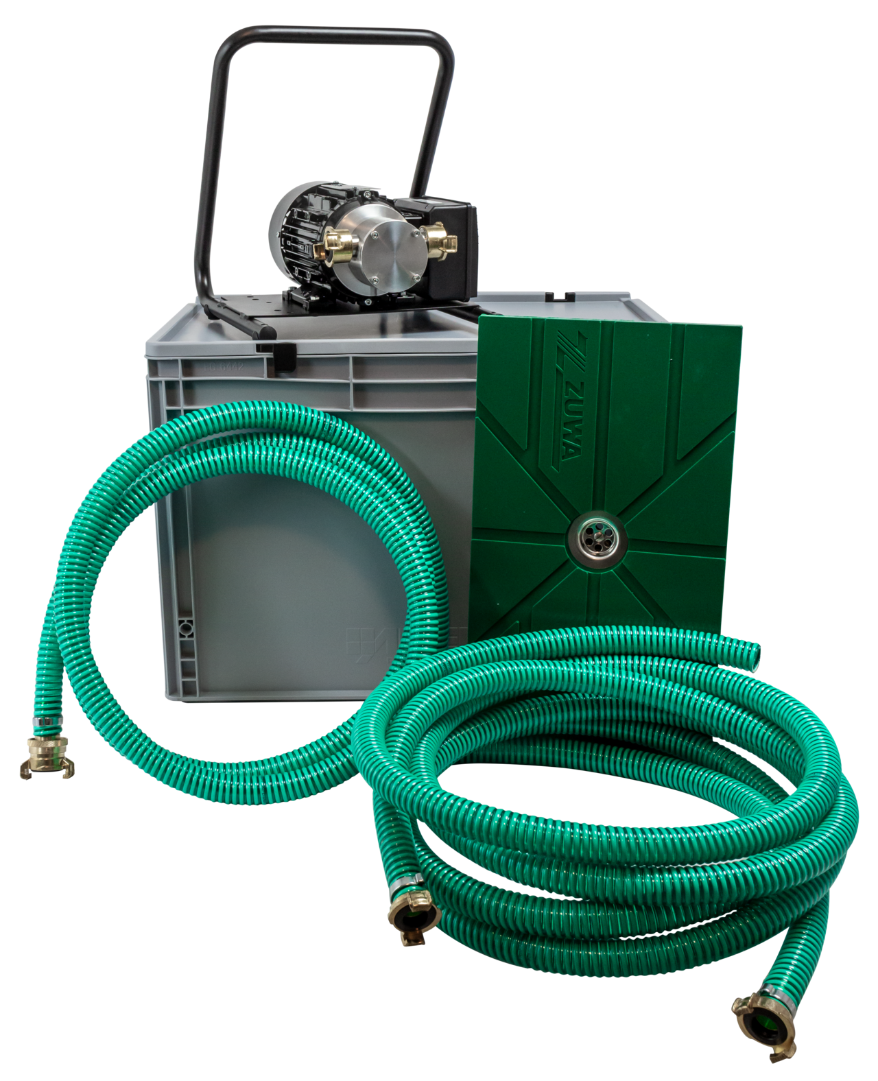 Für Überflutungen durch Hochwasser oder Starkregen haben wir unser Flachsaugset Kompakt in einem praktischen Eurobehälter mit Deckel verpackt. In die Box lässt sich die Flachsaugpumpe mit Tragegestell, Saugmatte und den drei, jeweils 3m langen Spiralschläuchen einfach und schnell verstauen.