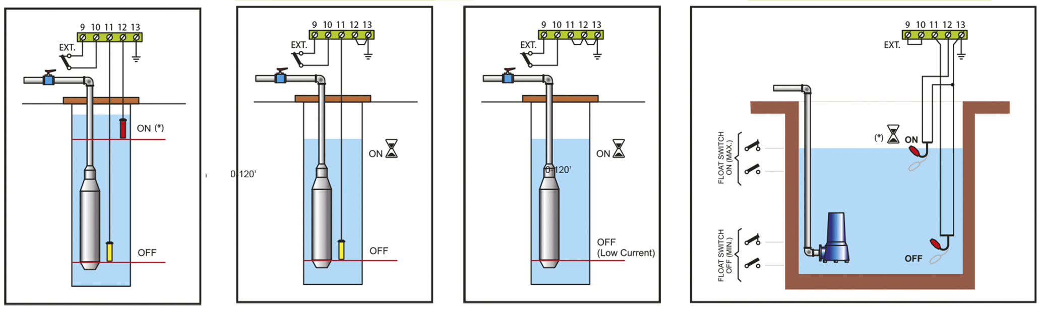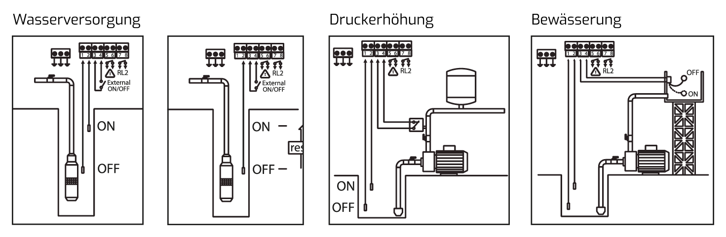 Pumpensteuerung für Tauchpumpen - mit Trockenlaufschutz, elektronischem Überlastungsschutz, Betriebskondensator für Pumpe und Eingang für Drucksteuerung