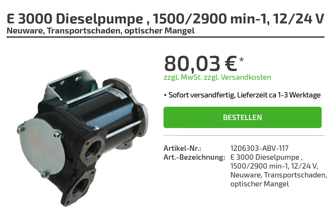 | Art.-Bezeichnung: | E 3000 Dieselpumpe, 1500/2900 min-1, 12/24 V Neuware, Transportschaden, optischer Mangel |