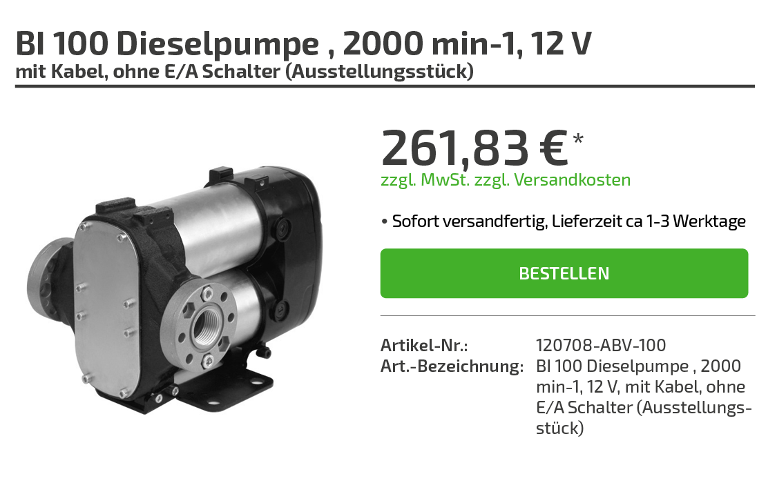 | Art.-Bezeichnung: | BI 100 Dieselpumpe , 2000 min-1, 12 V, mit Kabel, ohne E/A Schalter (Ausstellungsstück) |