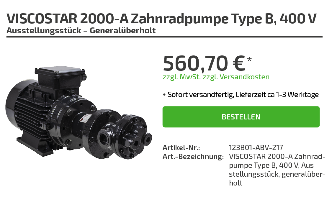 | Art.-Bezeichnung: | VISCOSTAR 2000-A Zahnradpumpe Type B, 400 V, Ausstellungsstück – Generalüberholt |
