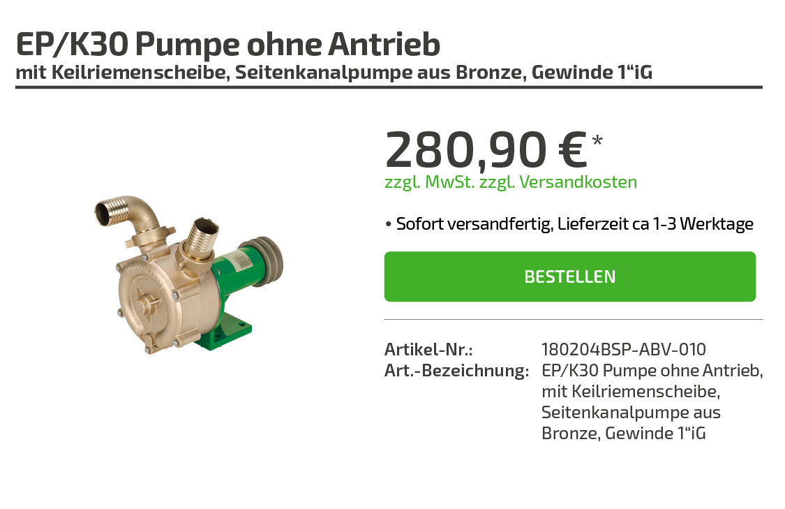 | Art.-Bezeichnung: | EP/K30 Pumpe ohne Antrieb, mit Keilriemenscheibe, Seitenkanalpumpe aus Bronze, Gewinde 1"iG |