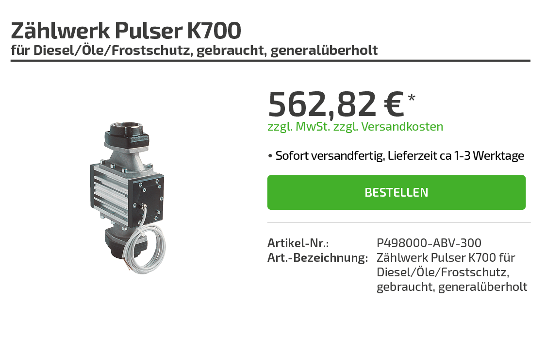 | Art.-Bezeichnung: | Zählwerk Pulser K700 für Diesel/Öle/Frostschutz gebraucht, generalüberholt |