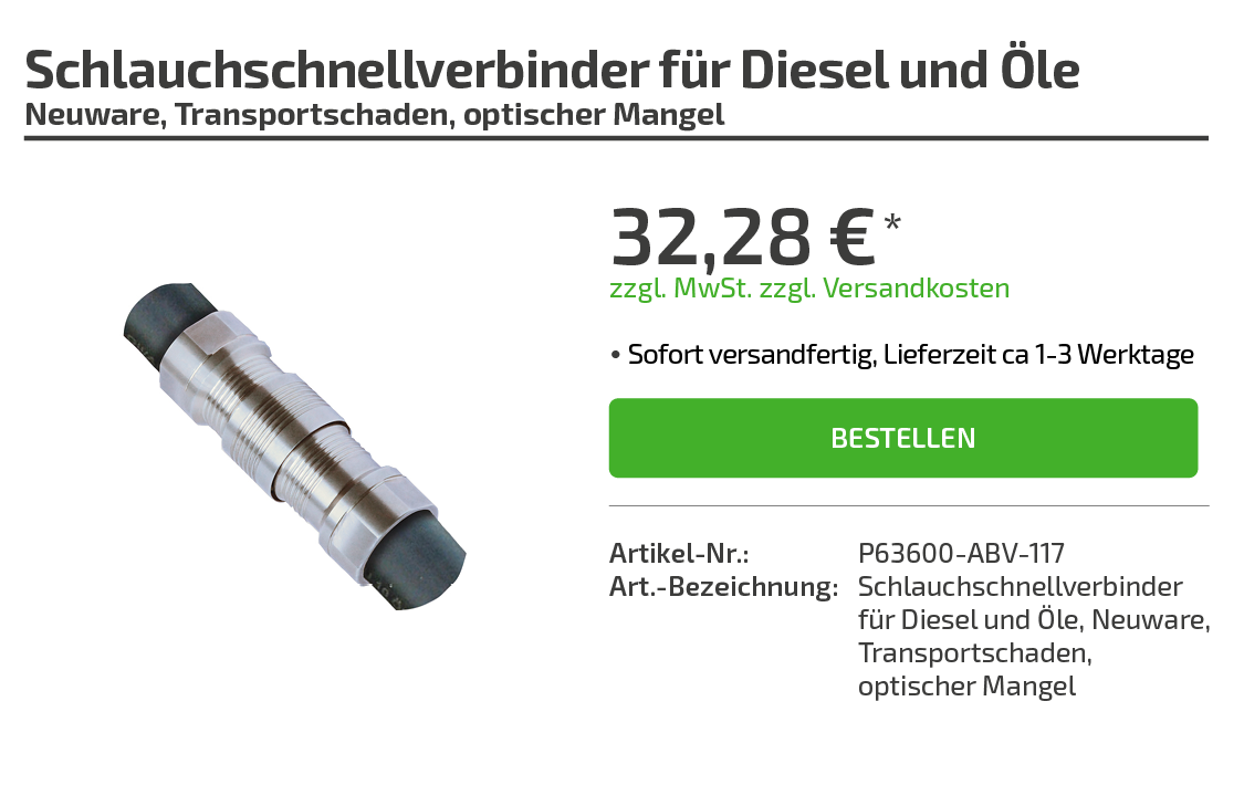 | Art.-Bezeichnung: | Schlauchschnellverbinder für Diesel und Öle Neuware, Transportschaden, optischer Mange |
